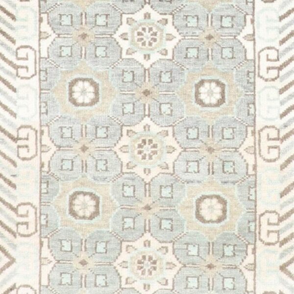 $2,600Original price was: $2,600.$1,200Current price is: $1,200.This beautiful, contemporary runner is made of wool & silk. It is primarily colored Silver and Blue. This rug is 2’11”x9’10”. Rug #: F0464