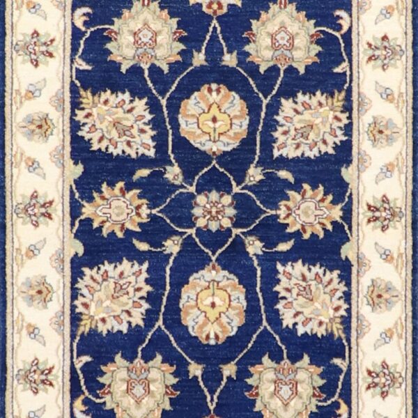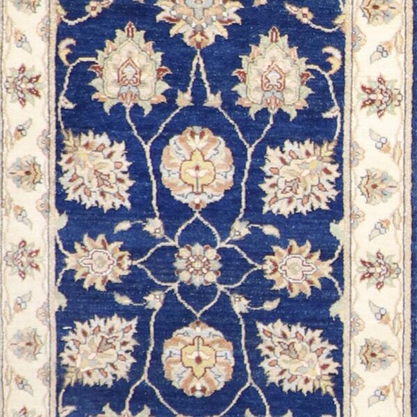 $3,300This beautiful, traditional runner is made of wool. It is primarily colored blue, and ivory. This rug is 2’6”x16’2”. Rug #: 010613