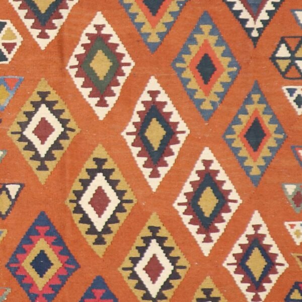 $1,700This beautiful, Persian, Kilim, Flatweave rug is made of wool. It is primarily colored orange and blue. This rug is 5’8”x8’1”. Rug #: 000921