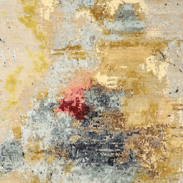 $3,100This beautiful, contemporary rug is made of silk. It took over six months to make this rug from start to finish. It is primarily colored brown, yellow, blue, and red. The rug is 5’5”x8’7”. Rug #: 010245
