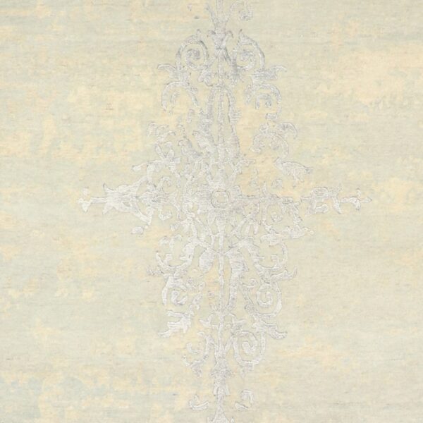 $8,400This beautiful, Transitional rug is made of wool & silk. It is primarily colored gray, ivory, and silver. The rug is 8’1″x10’2″. Rug#: 012685