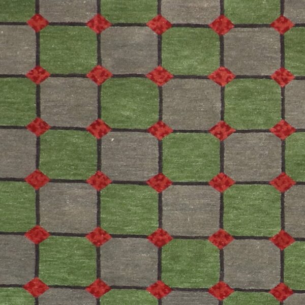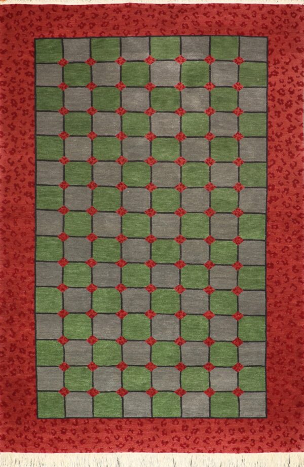 $4,900Original price was: $4,900.$3,900Current price is: $3,900.This beautiful, modern rug is made of wool and silk. It is red, green, and cream. The rug is 6’1″ x 8’10″. Rug#: 002489