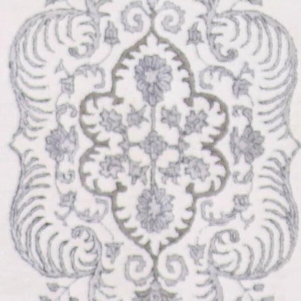 $900DETAILS Style: Decorative Size (width): 4′ Size (length): 6′ Material: Wool & Silk Pattern: Vintage Primary Color: Gray Additional Colors: Ivory and Silver Sku: t0150