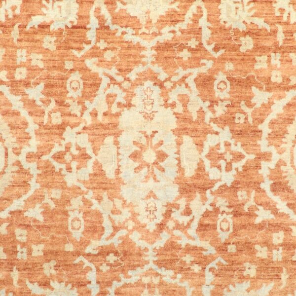 $5,900This beautiful, traditional rug is made of wool. It primarily is colored orange, brown, and ivory. The rug is 8’x9’11”. Rug#: 004081