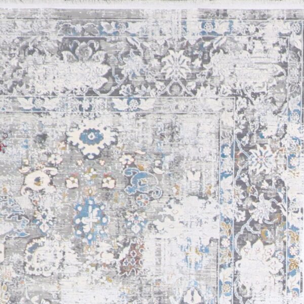 $3,900This beautiful, transitional rug is made of wool & silk. It is primarily colored gray, blue, and gold. The rug is 7’8”x11’1”. Rug#: F0147