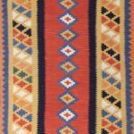 This beautiful, decorative, flat-weave Persian Kilim runner is made of wool. It is primarily colored tan, gold, blue, and orange. The rug is 2’8”9’7”.