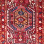 This beautiful, tribal, Persian runner is made of wool. It is primarily colored red and navy. This rug is 3’10”x11’.