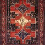This beautiful, traditional rug is made of wool. It primarily is colored orange, black, and blue. The rug is 4’2″x5’8″.