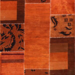 This beautiful, patched rug design is made of wool. It is primarily colored rust-red. This rug is 4’2”x6’.