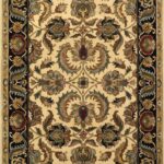 This beautiful, decorative rug is made of wool. It is primarily is colored tan, black, and green. The rug is 5’1″x7′.