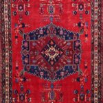 This beautiful, Persian Tribal rug is made of wool. It is primarily colored red, navy, and blue. The rug is 5’3”x7’4”.
