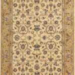 This beautiful, traditional rug is made of wool & silk. It is primarily colored tan, brown, green, and pink. The rug is 5’x8’.