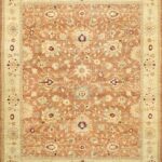 This beautiful, traditional rug is made of wool. It is primarily colored orange, ivory, and burgundy. The rug is 7’11”x10’.