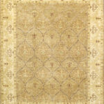 This beautiful, decorative rug is made of wool. It is primarily colored light brown, gold, and green. The rug is 7’11”x10’2”.