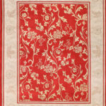 This beautiful, contemporary, Aubusson, rug is made of wool & silk. It took about one year to make this rug. It primarily is colored cream, tan, and red. The rug is 7’11″x10’3″.