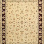 This beautiful, traditional rug is made of wool. It is primarily colored tan, brown, and green. The rug is 7’11”x9’11”.