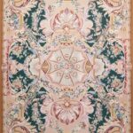 This beautiful,Aubusson, flat-weave rug is made of wool. It is primarily colored tan and gold. This rug Is 8’10”x11’11”.