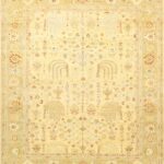 This beautiful, traditional rug is made of wool. It took a year to make this rug from start to finish. It is primarily colored tan, green, and orange. The rug is 8’x9’8”.