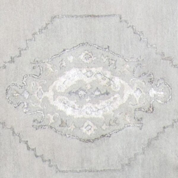 $1,100This beautiful, decorative rug is made of wool & silk. It is primarily colored gray, ivory, and silver. The rug is 5’x5’. Rug#: t0334